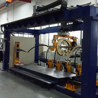 包帶頭安裝于移動式龍門上,可在寬度方向(Y軸)及高度方向(Z軸)自動移動并隨龍門實現(xiàn)長度方向(X軸)移動??倷C(jī)由六個控制軸聯(lián)動控制以實現(xiàn)對三維線棒的最佳絕緣包帶。包帶頭進(jìn)行了平衡設(shè)計以保證高速包帶時的穩(wěn)定性,可實現(xiàn)1盤包帶或2盤包帶,包帶張力可根據(jù)需要設(shè)定并實現(xiàn)恒張力。
